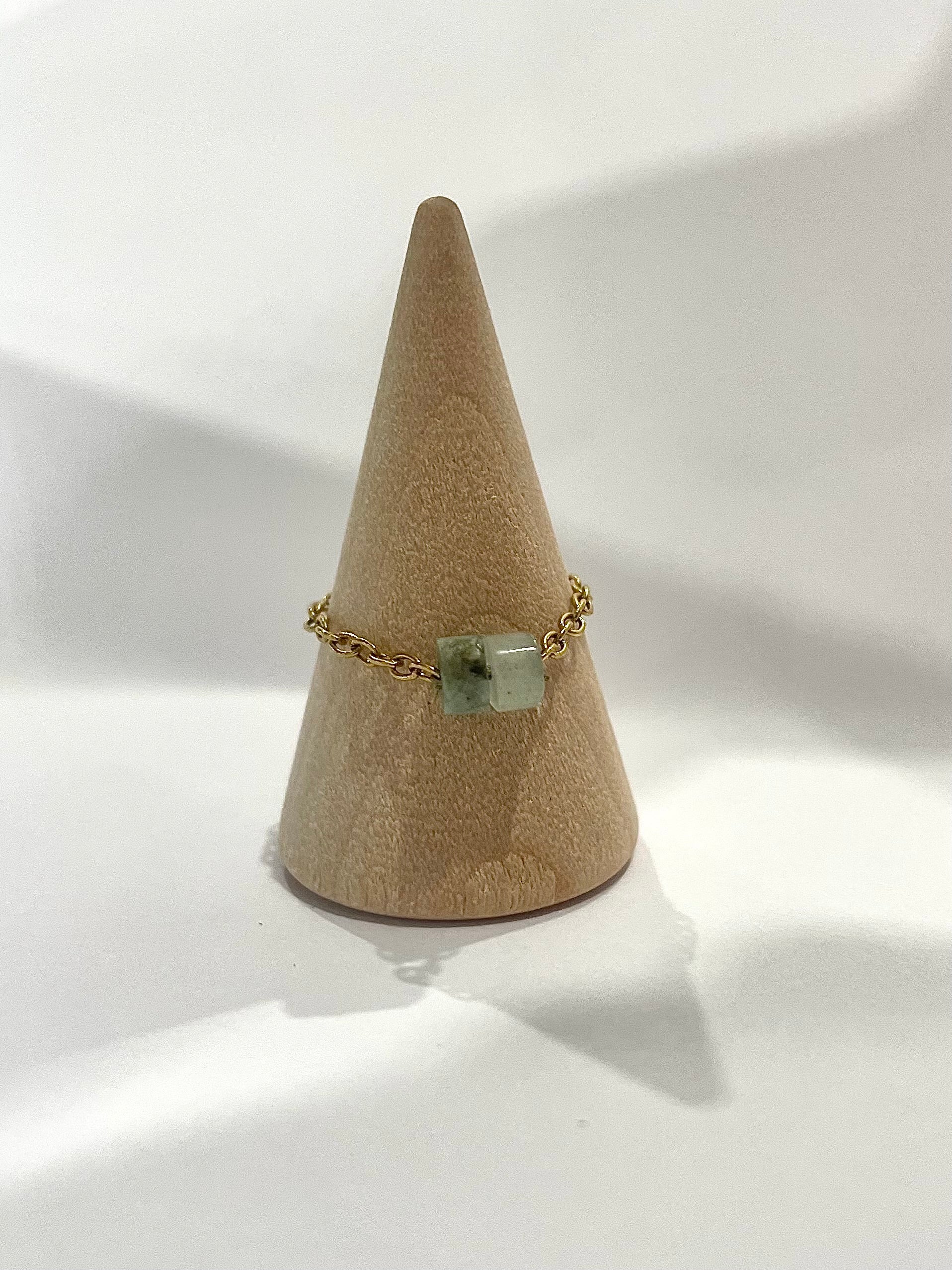 Bague légère et discrète réalisée avec une chaîne fine en acier inoxydable ornée de petites pierres africaine et d’Aventurine verte.
