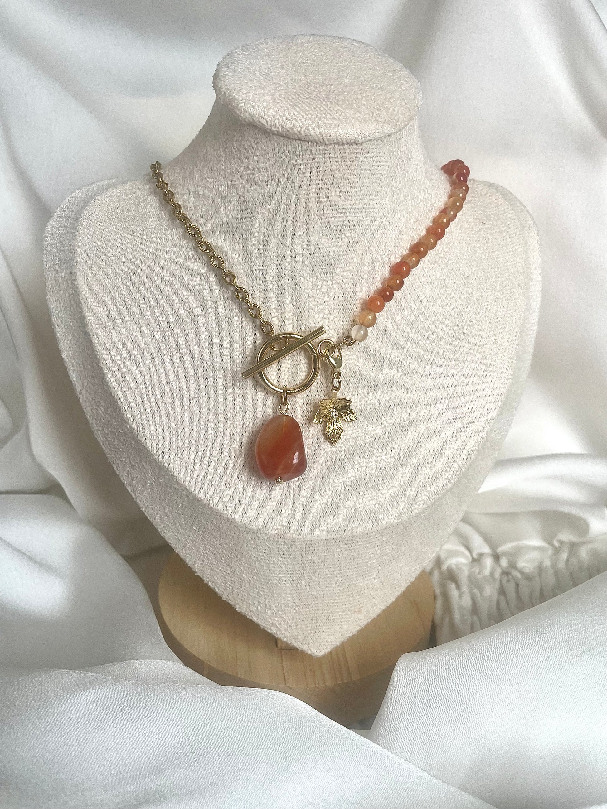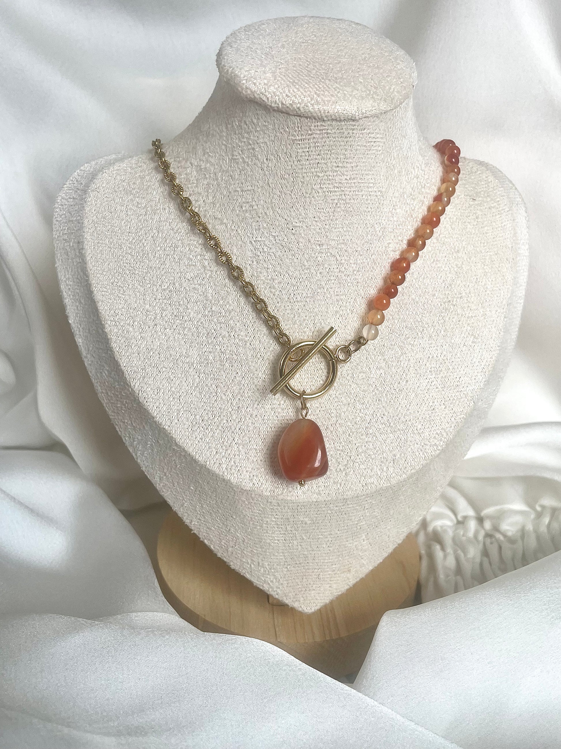 Le collier Aprodige (ras de cou) est fabriqué avec de la pierre de Cornaline (variété de calcédoine rouge). Associée au chakra sacré, symbole de passion, de vitalité et de créativité.