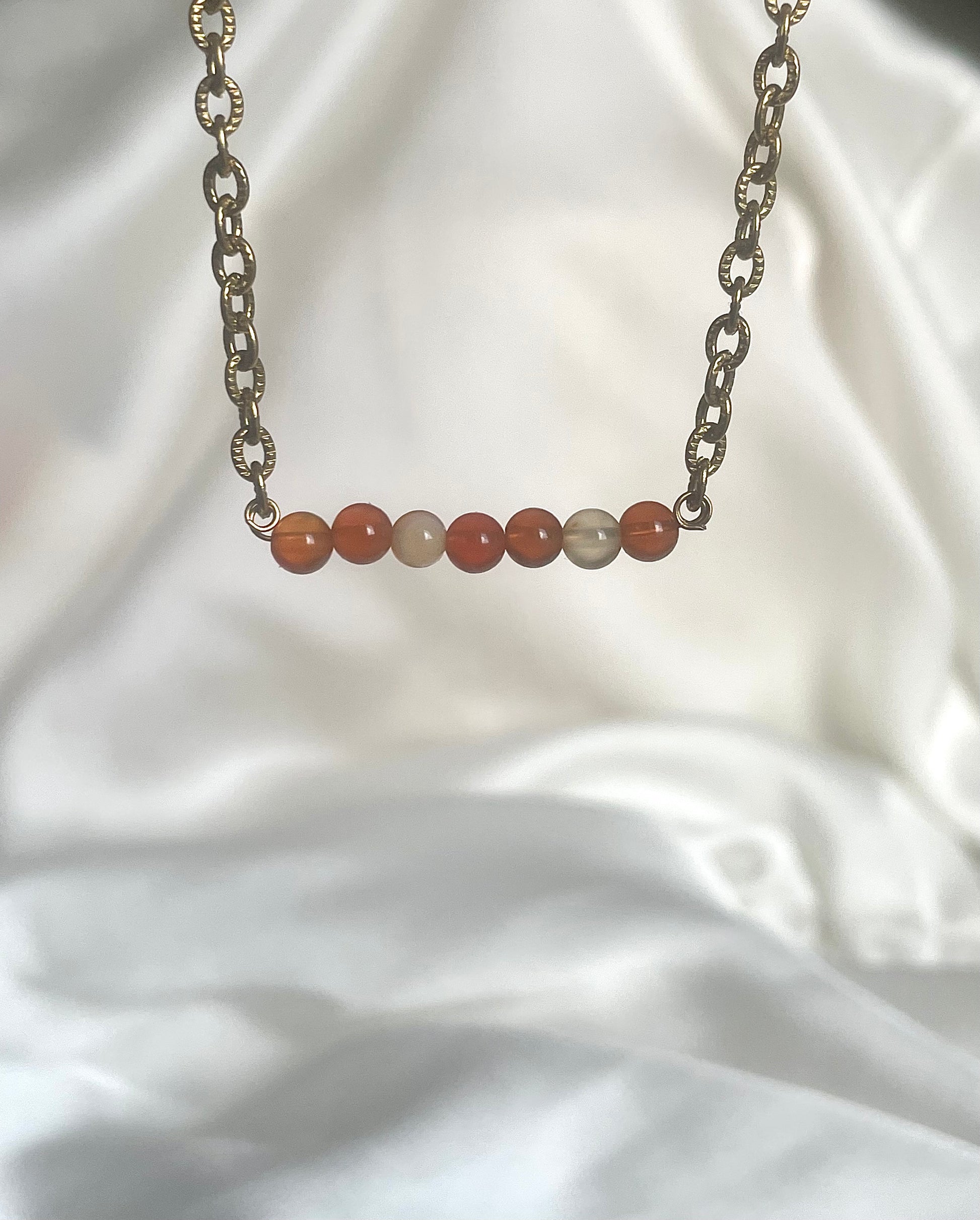 Le bracelet Aprodite est fabriqué avec de la pierre de Cornaline (variété de calcédoine rouge). Associée au chakra sacré, symbole de passion, de vitalité et de créativité.