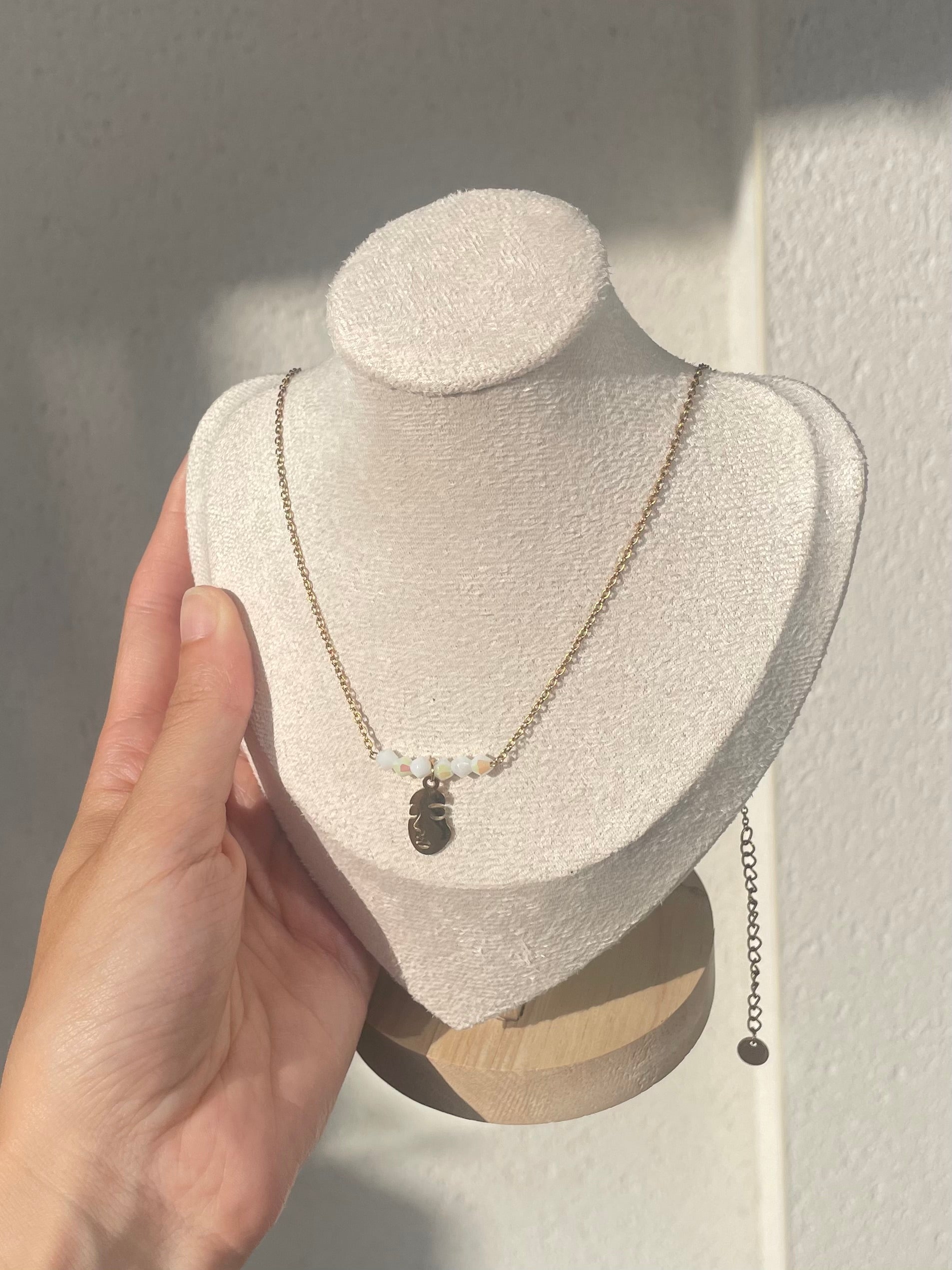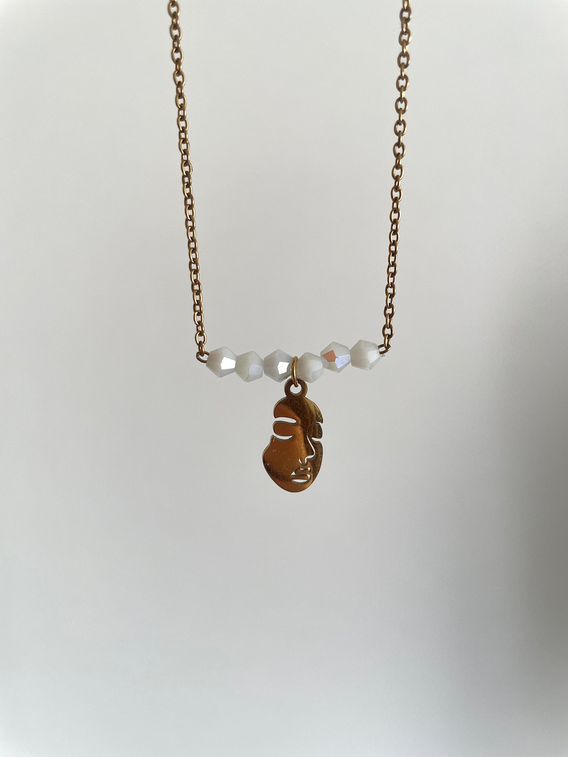 Collier minimaliste avec pendentif visage et une perle en verre blanche qui apporte élégance et simplicité.