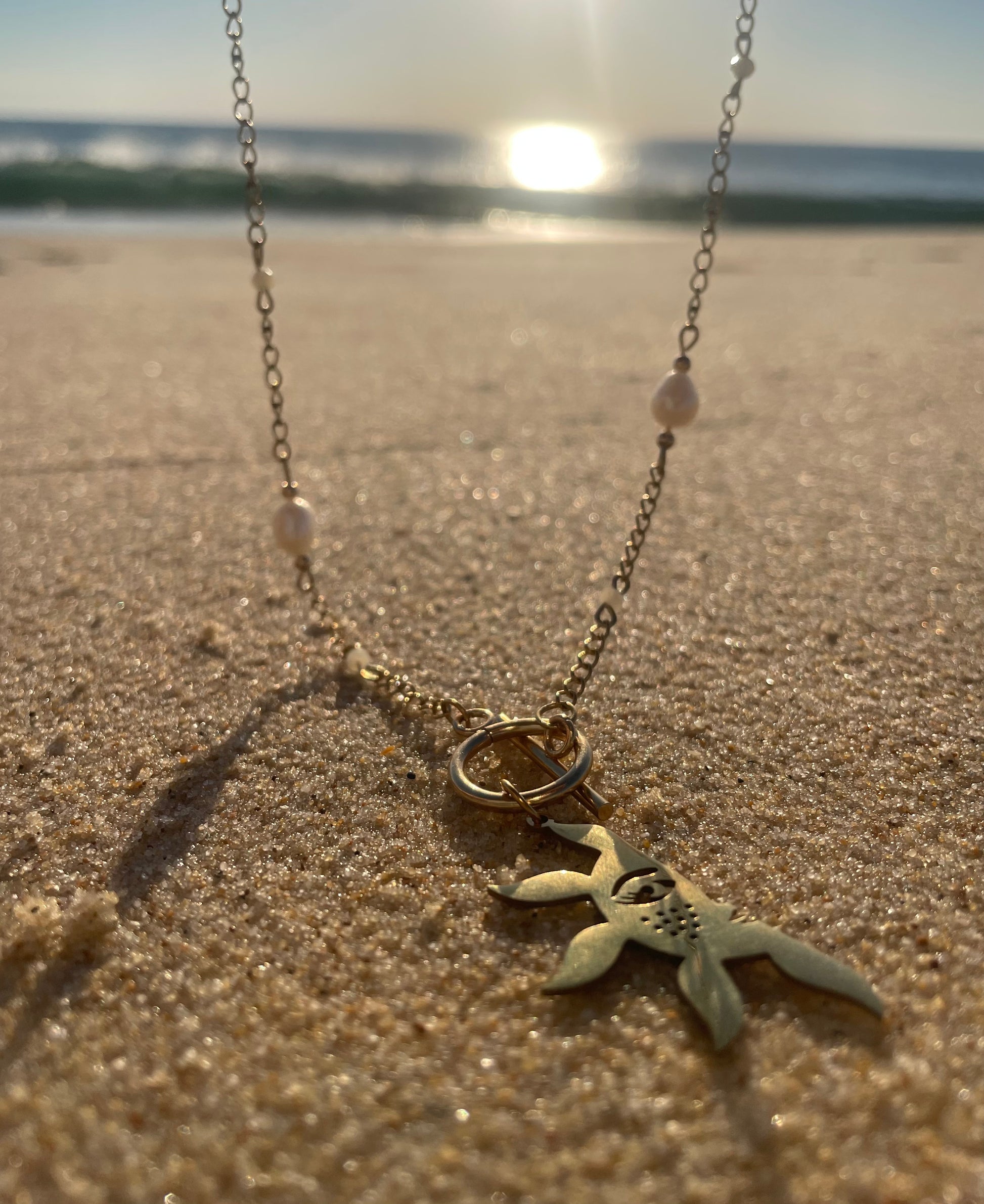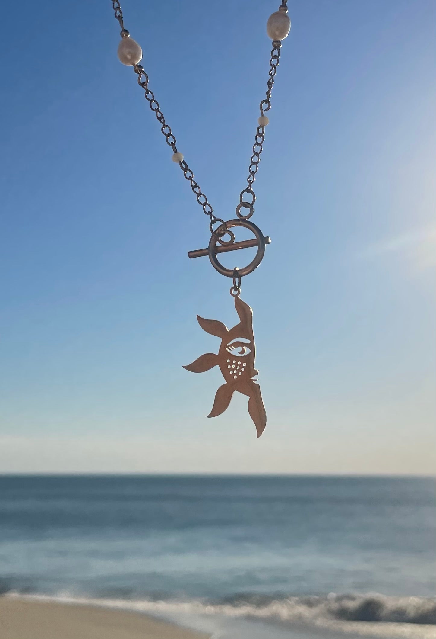 Ajoutez une touche d'éclat à votre tenue avec notre collier Solena ! Fabriqué en acier inoxydable avec un fermoir T à l'avant, ce collier présente un magnifique pendentif demi soleil accompagné de perles d'eau douce et de perles en verre blanche.