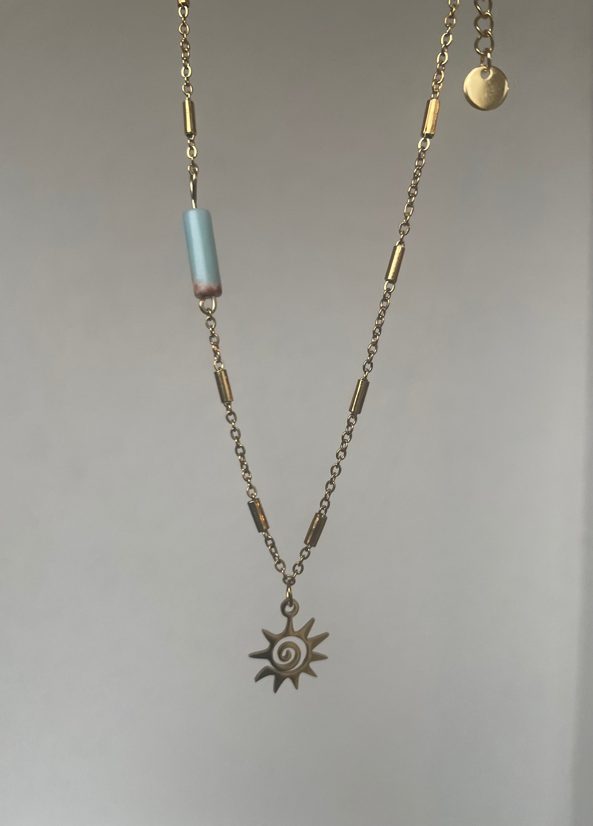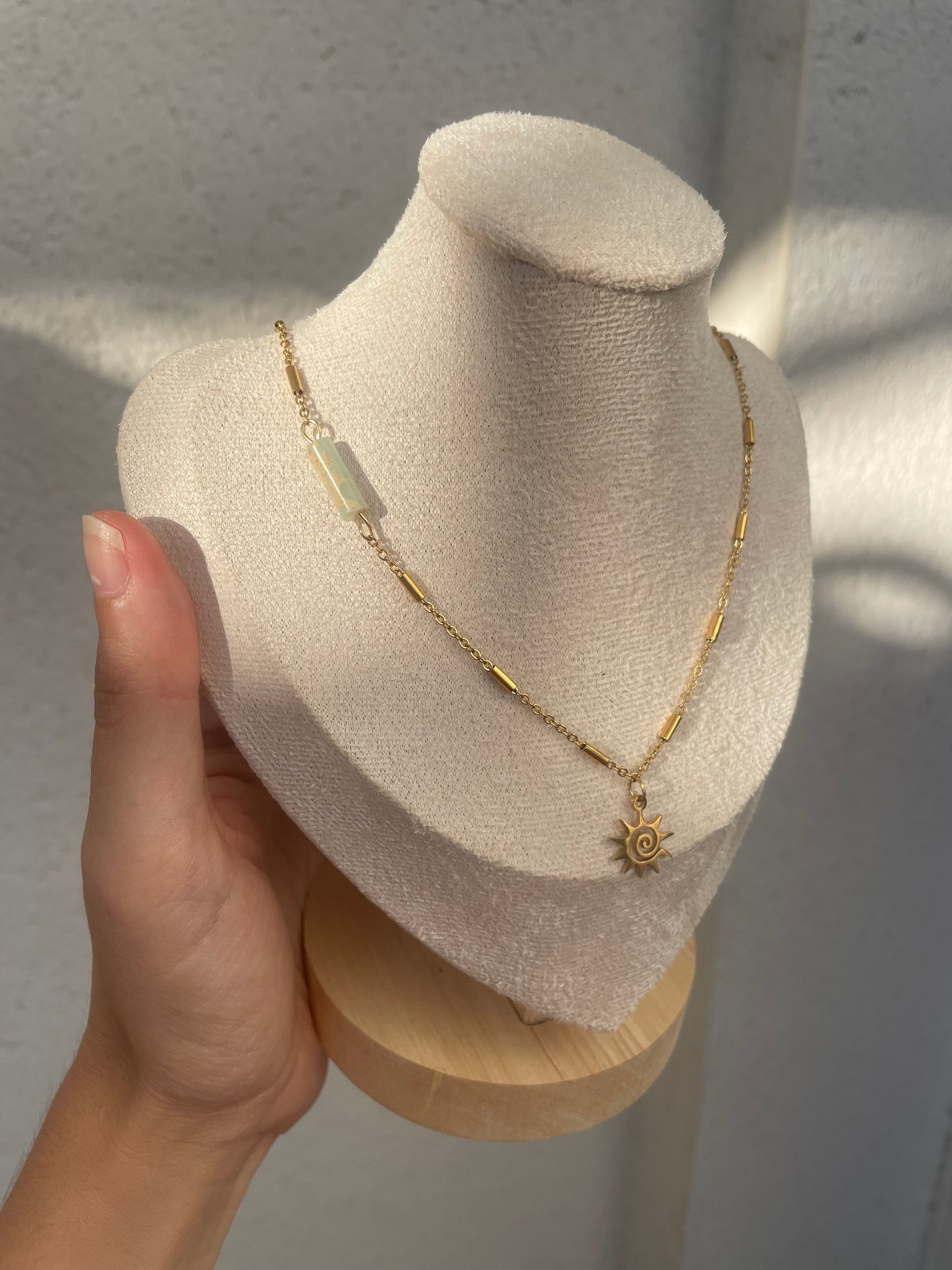 Auréa est un collier en acier inoxydable orné d'un pendentif soleil doré et d'une pierre de shushan. Léger et résistant, il ajoutera une touche d'éclat à votre tenue tout en apportant une énergie positive grâce à la pierre de shushan.