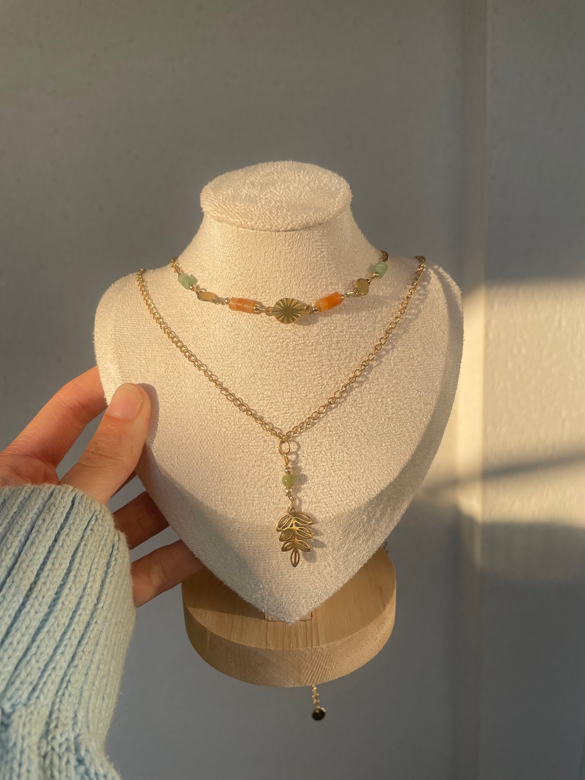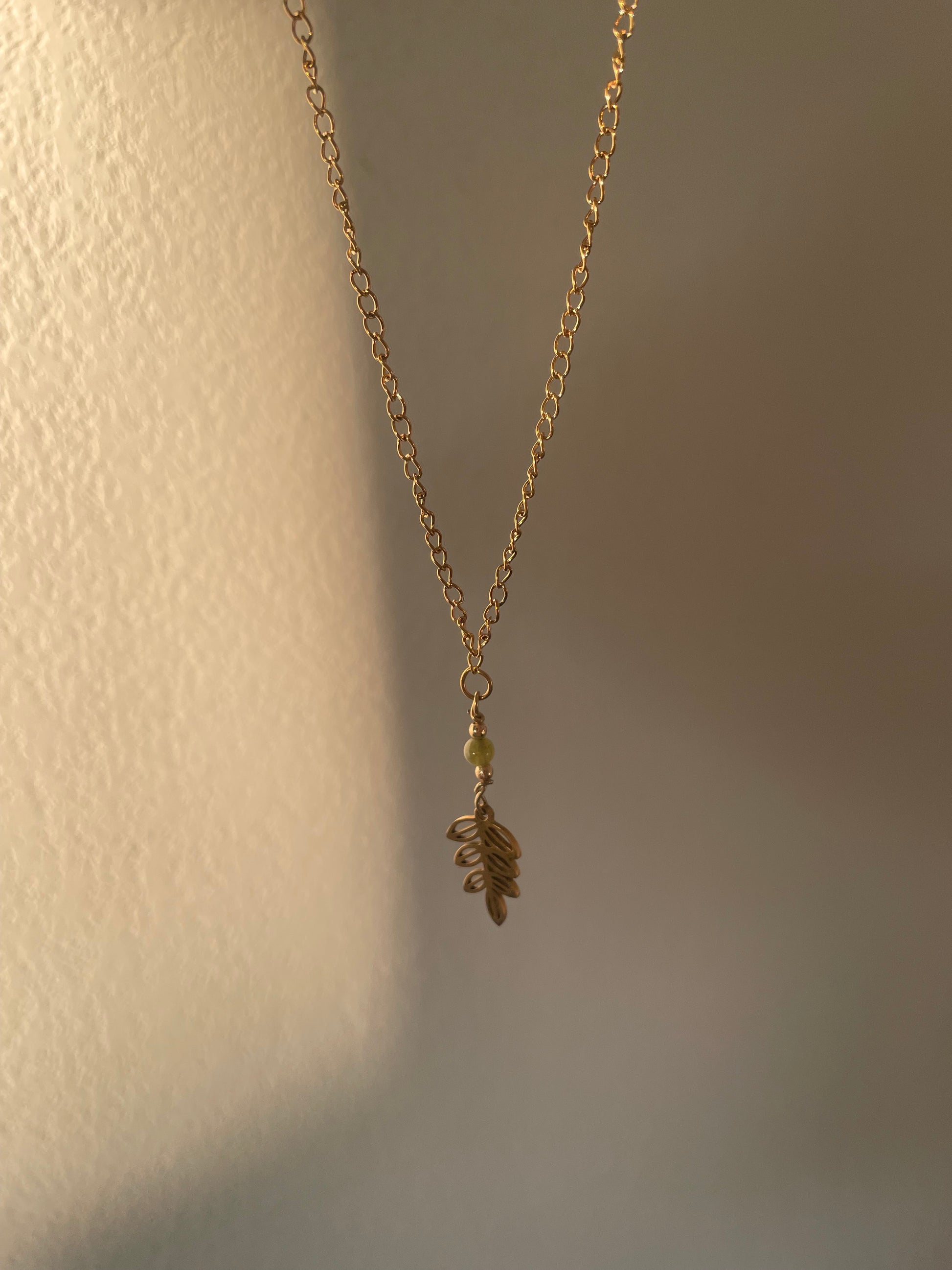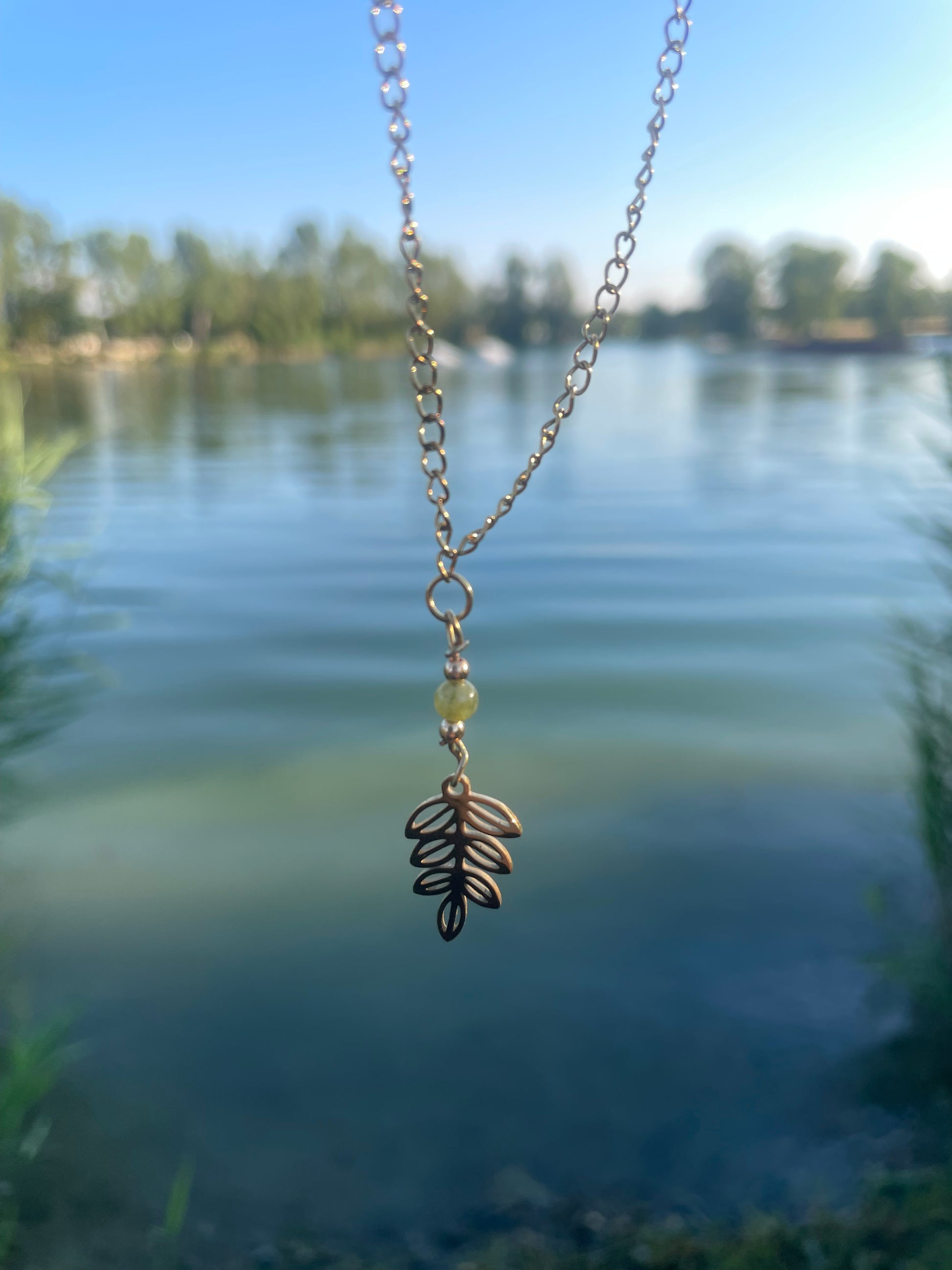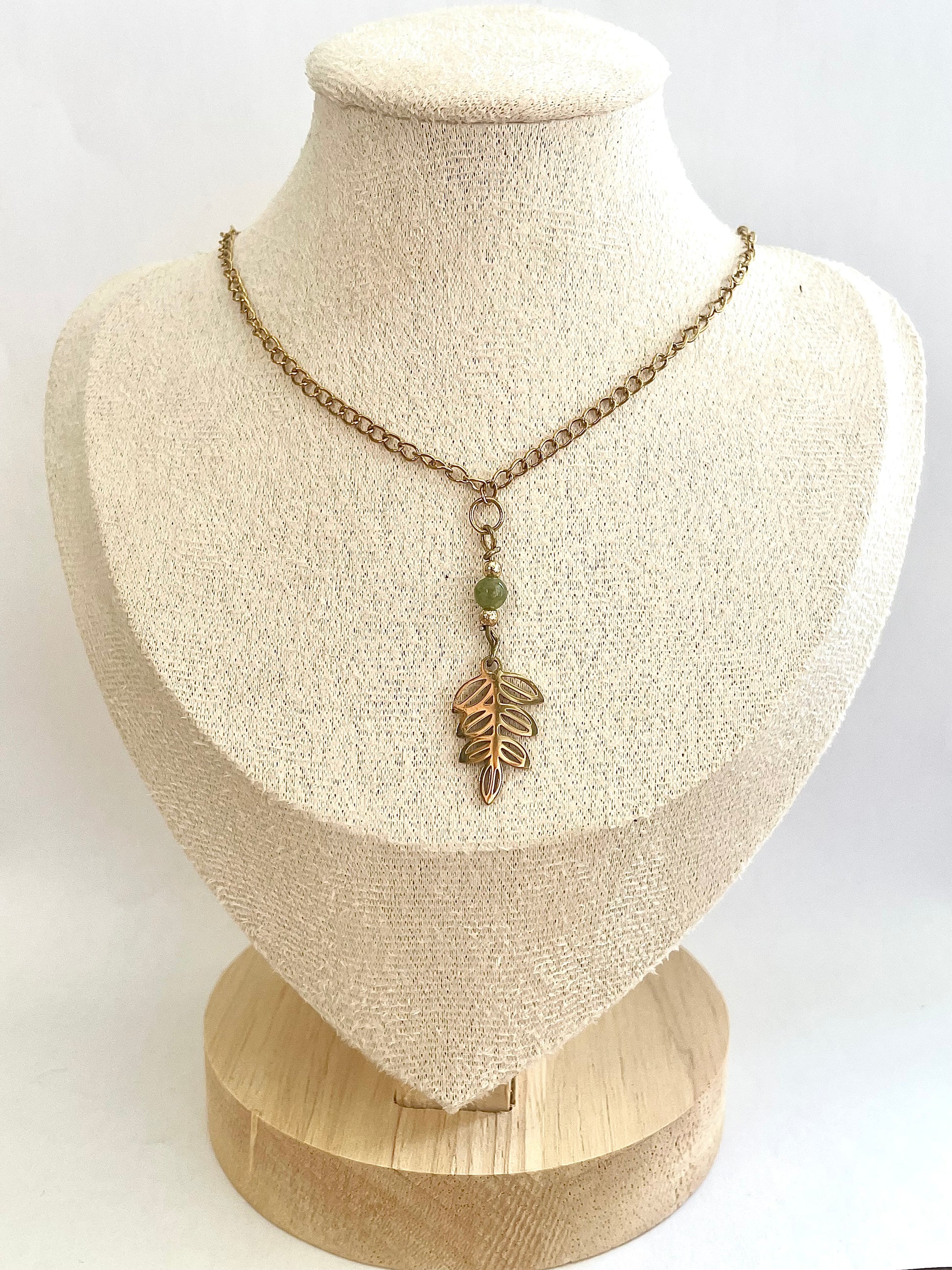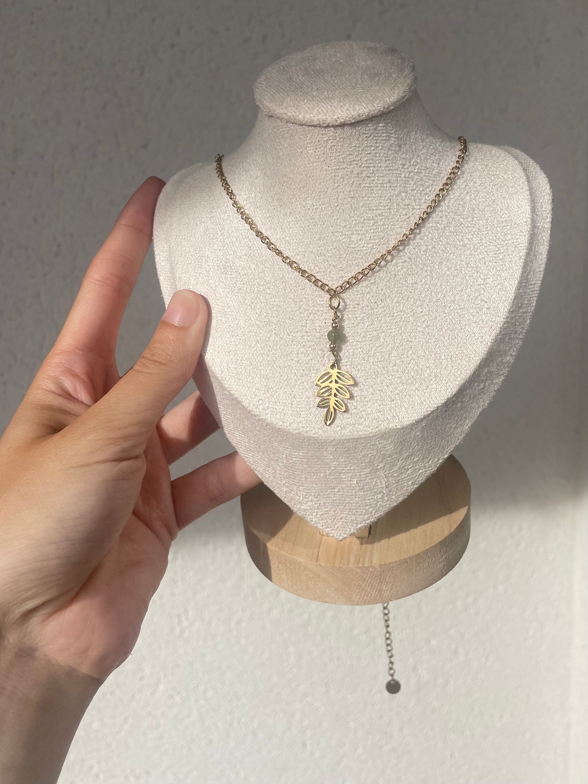Collier avec un pendentif feuille et une perle d'aventurine verte qui apportent une élégance subtile tout en rappelant les bienfaits de la nature.