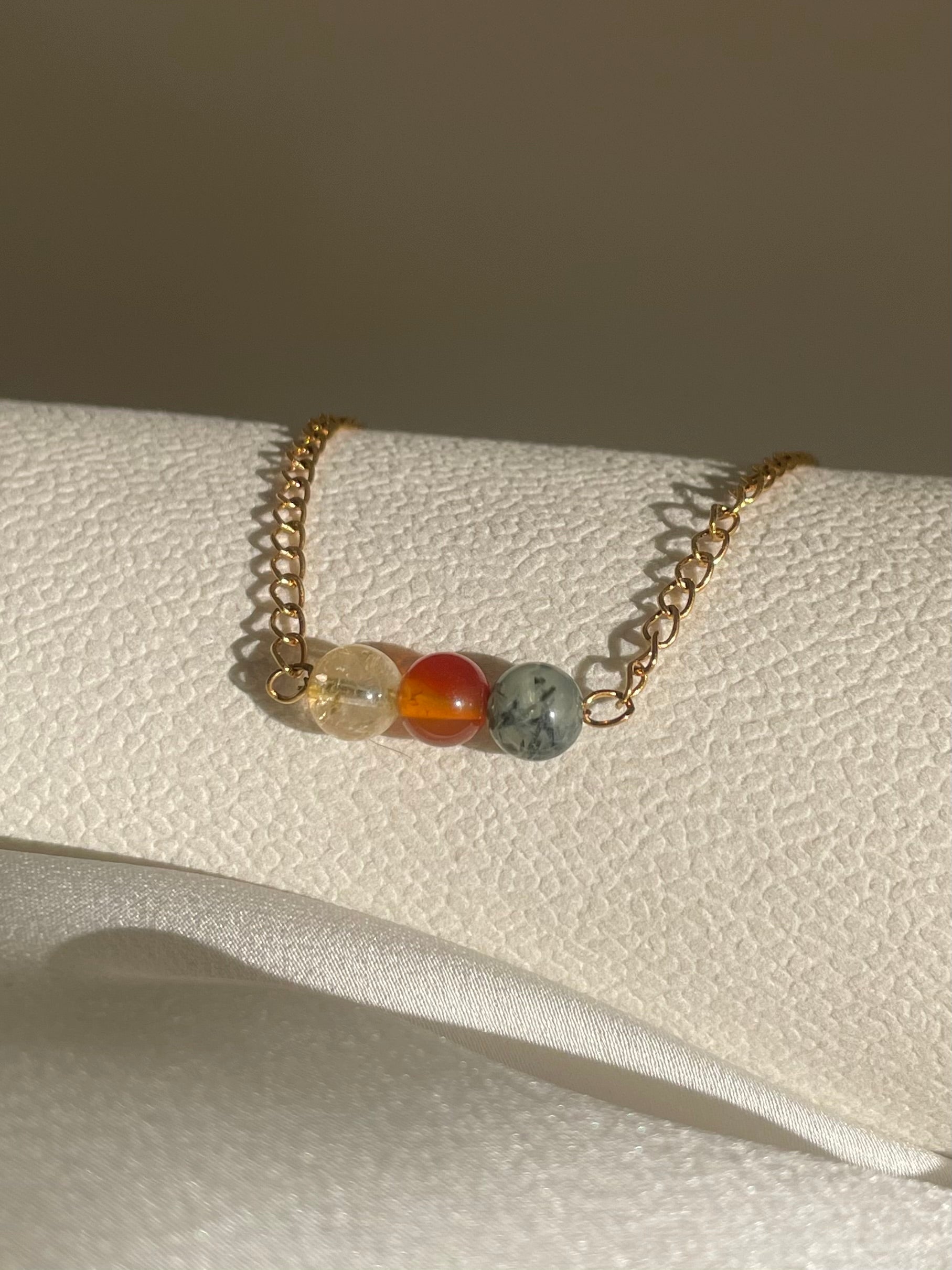 Composé de citrine, d’agate mousse et de cornaline, ce bracelet rayonne de vitalité et d’équilibre.