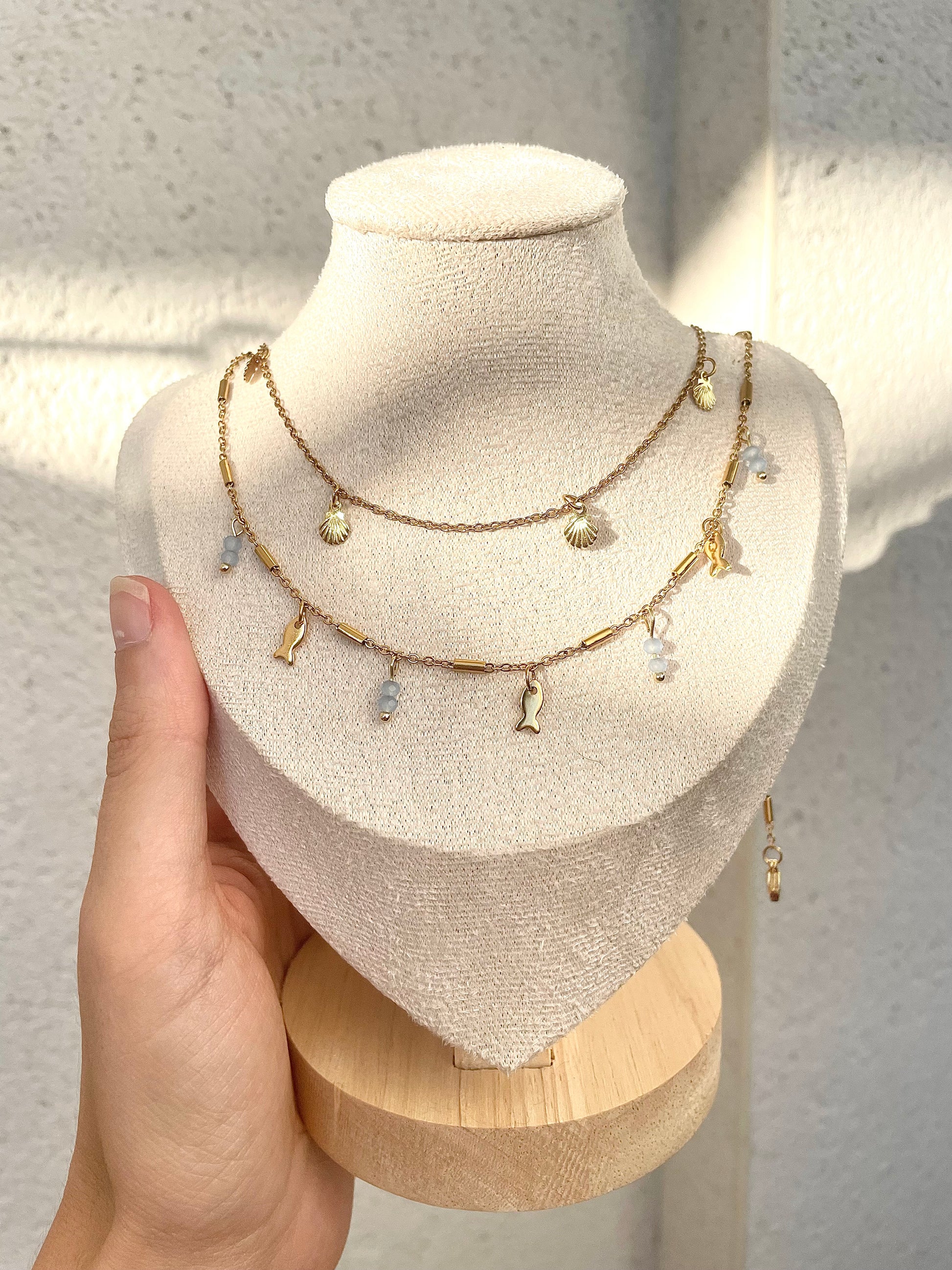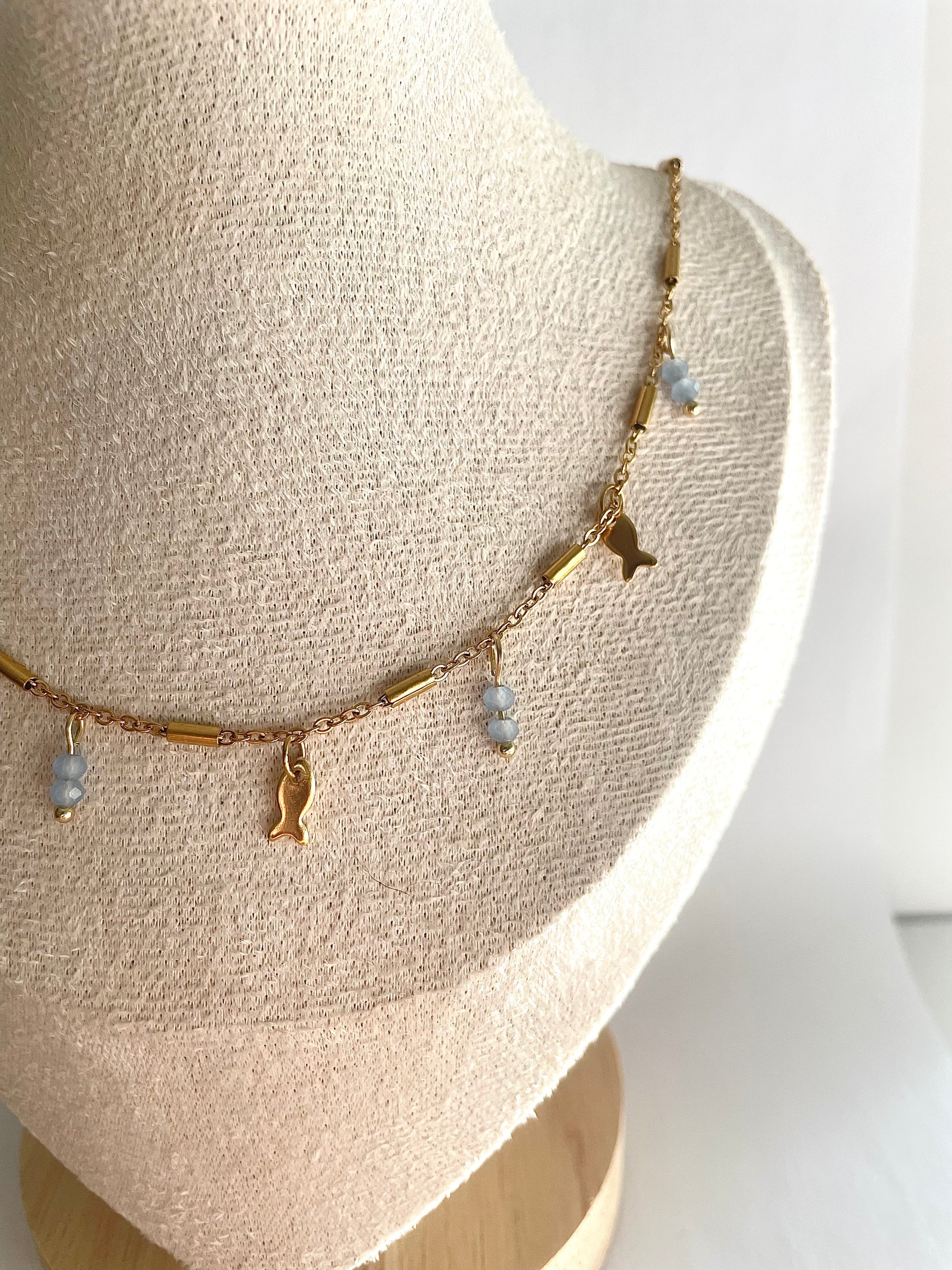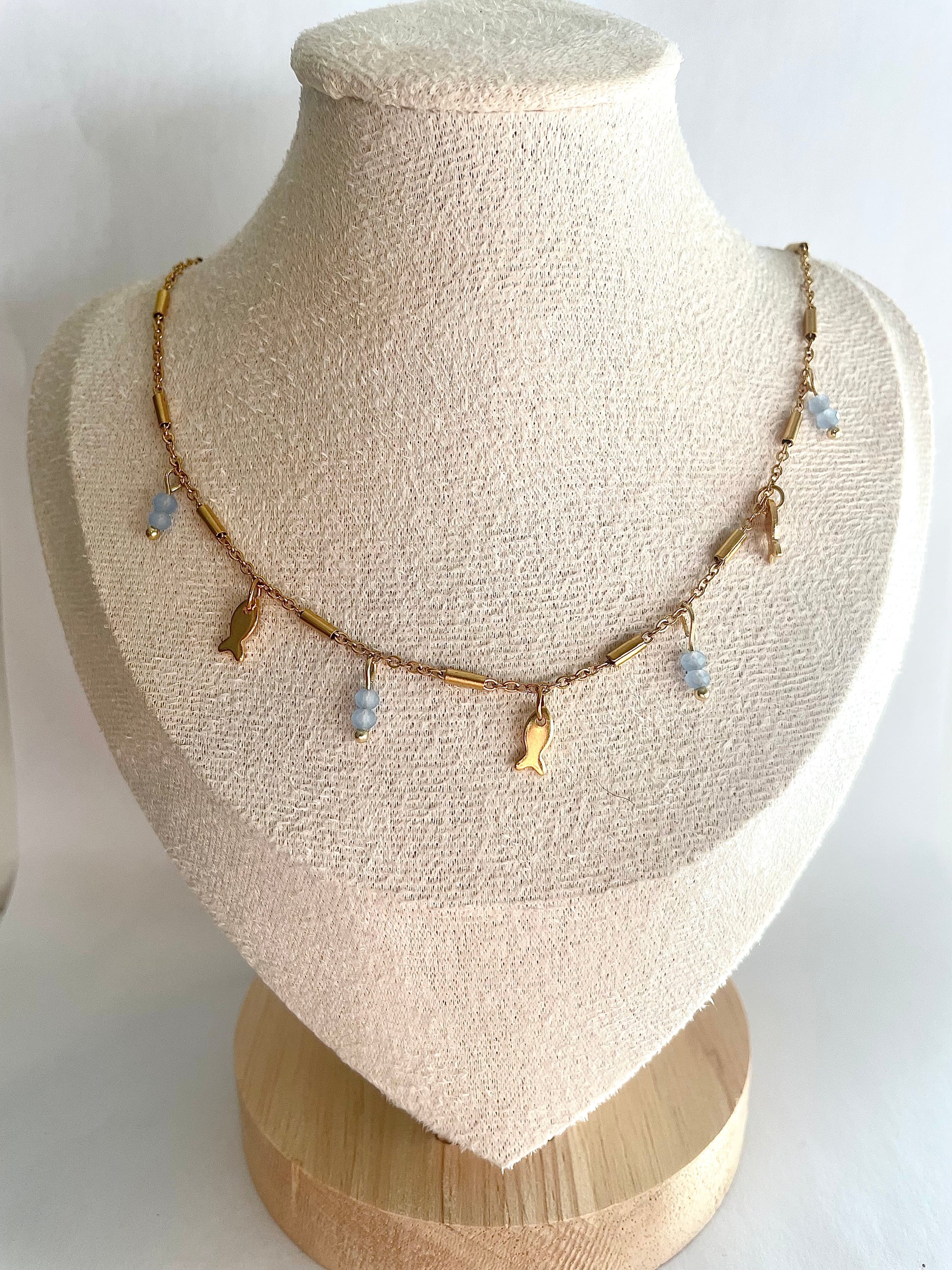 Ce collier Moana est orné de petits poissons et de perles en verre bleu pour une touche marine élégante. Idéal pour les amateurs de la mer et les amoureux de la nature.