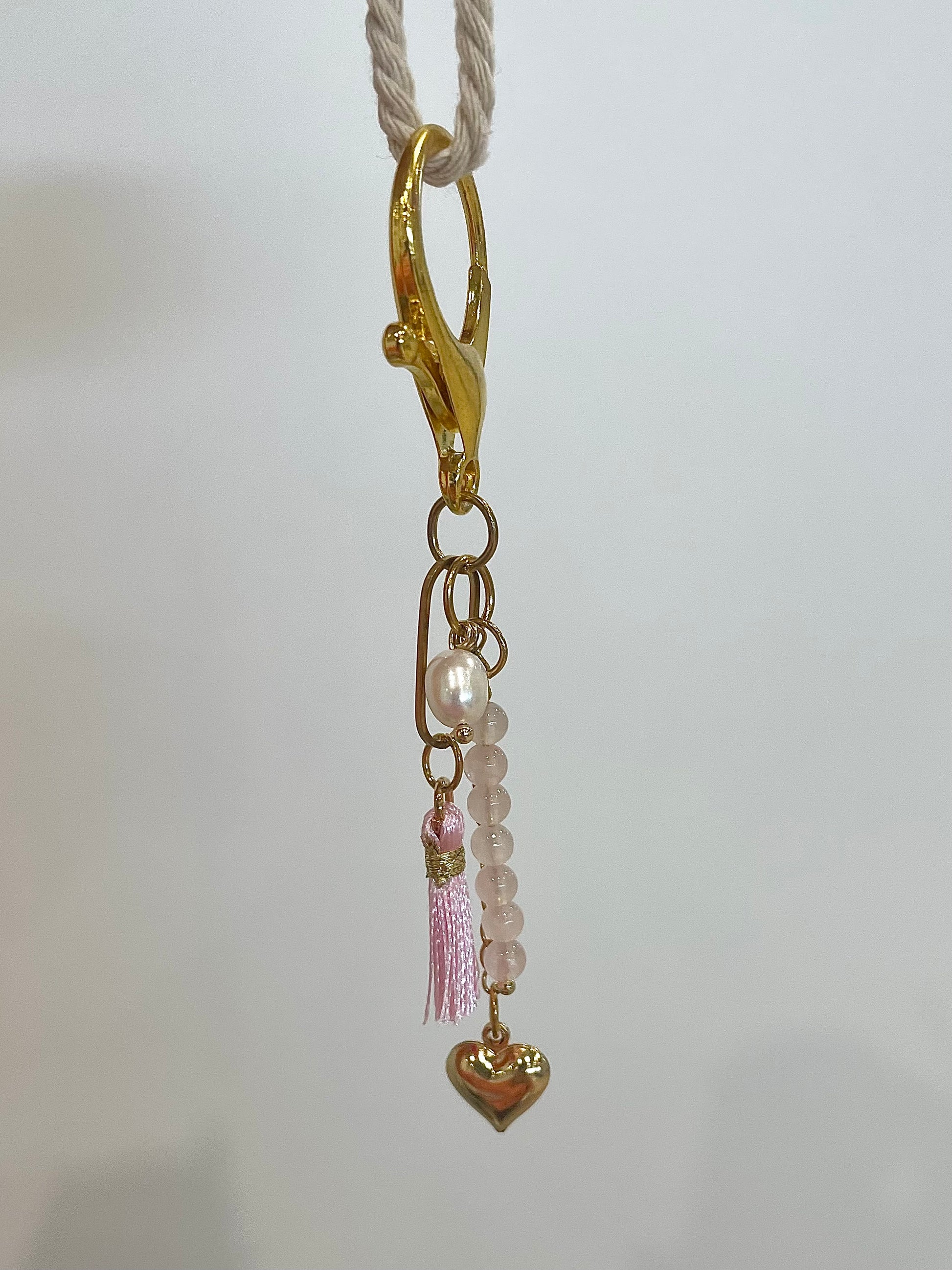 Porte Clef en acier inoxydable avec fermoir homard agrémenté d’un petit pompon rose, d’un cœur, d’une perle d’eau douce, et de perles en pierre de Quartz Rose. Porte clefs porte bonheur et symbolique.